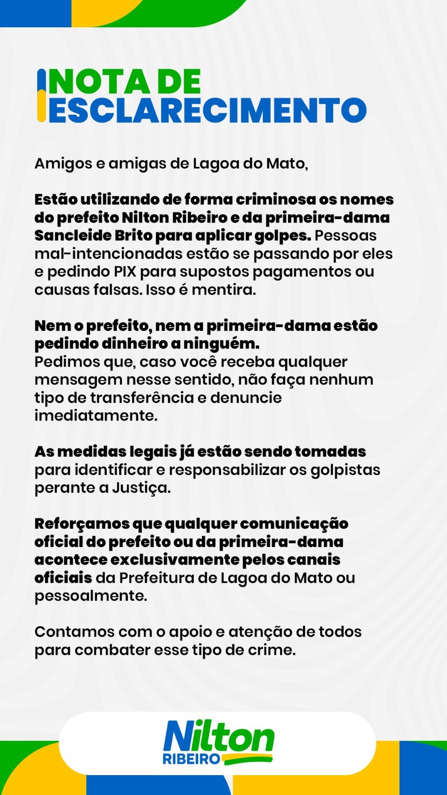 A Prefeitura de Lagoa do Mato emitiu uma nota de esclarecimento para alertar a população sobre golpes que estão sendo aplicados utilizando de forma criminosa