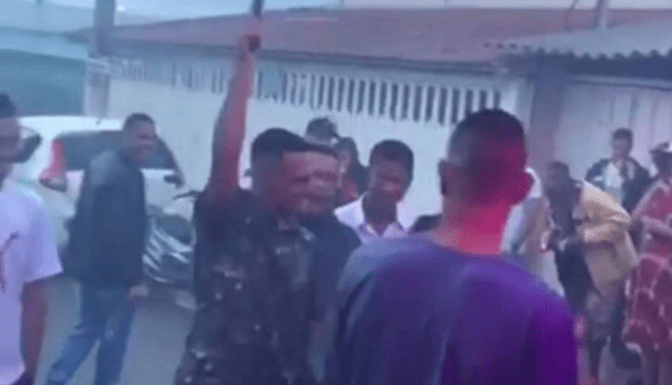 Em determinado momento, um deles saca uma pistola com pente alongado e atira para cima. Um dos suspeitos seria soldado do Exército. Imagens publicadas em