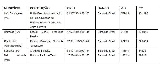Veja, abaixo, como fazer sua doação para as instituições selecionadas: