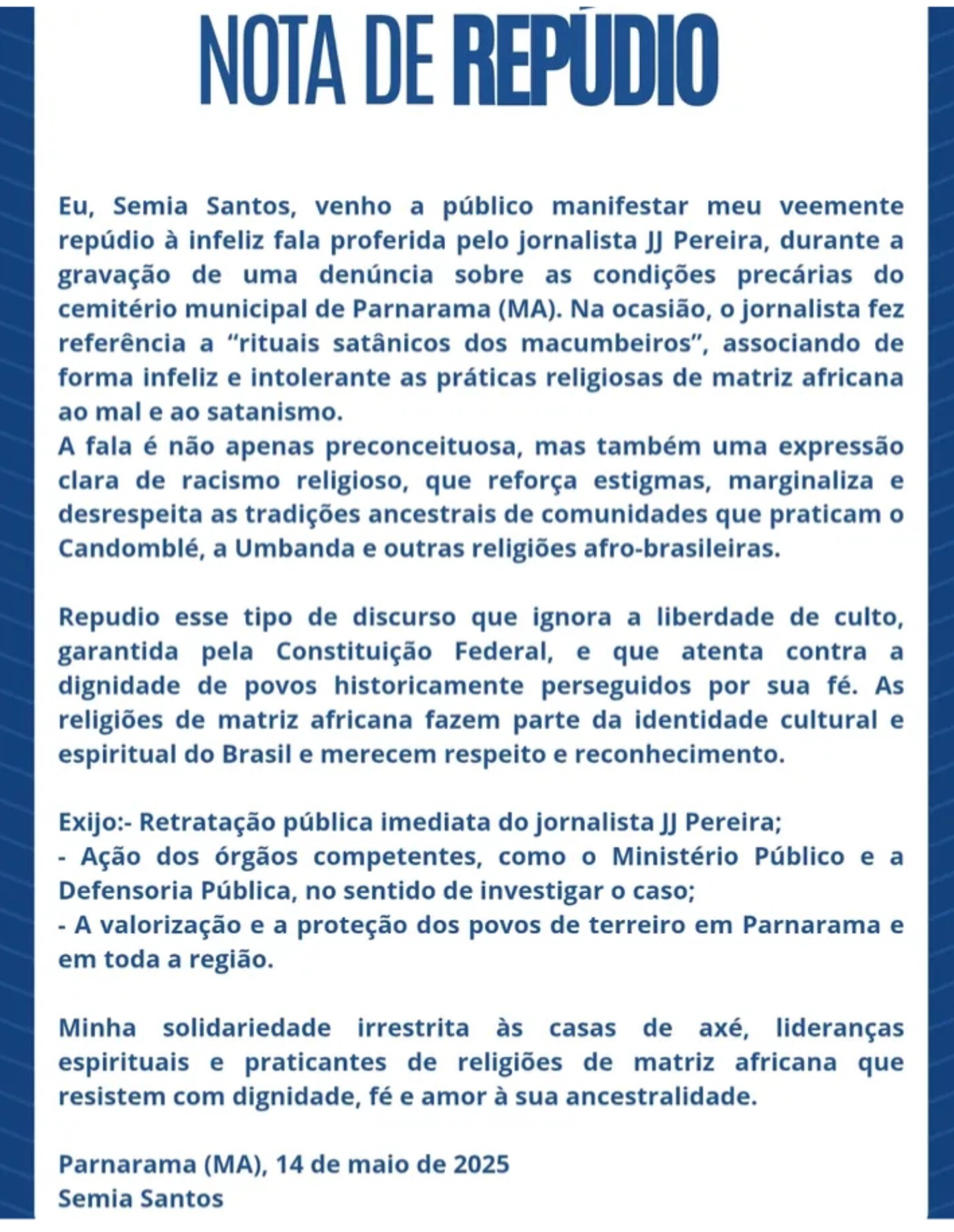 A ativista Semia Santos veio a público nesta terça-feira (14) manifestar veemente repúdio à fala do jornalista JJ Pereira, proferida durante a gravação de uma denúncia sobre as condições do cemitério municipal de Parnarama. Segundo Semia, o jornalista associou de forma pejorativa e intolerante as religiões de matriz africana ao satanismo, referindo-se a “rituais satânicos dos macumbeiros”.