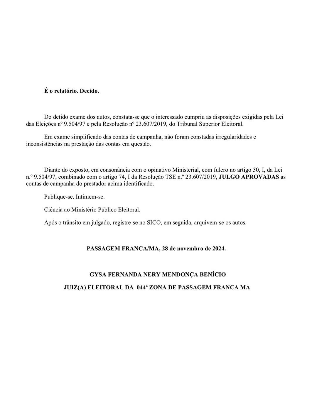 A Justiça Eleitoral ressaltou que todas as despesas e arrecadações da campanha foram devidamente declaradas, não havendo inconsistências ou irregularidades. A aprovação das contas representa mais um passo importante para o início de um novo ciclo administrativo no município de Passagem Franca.