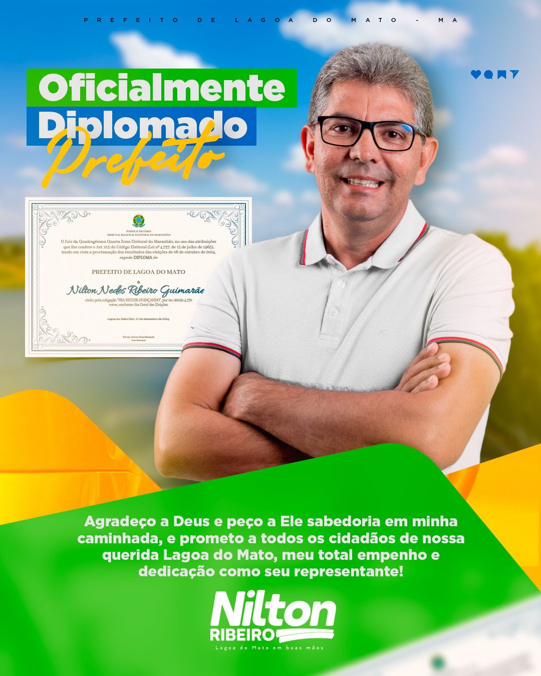 “Peço a Deus sabedoria para seguir esse caminho com responsabilidade e humildade. Prometo meu empenho total para transformar sonhos em realidade, fazendo de Lagoa do Mato um lugar cada vez melhor para todos”, declarou o prefeito eleito.