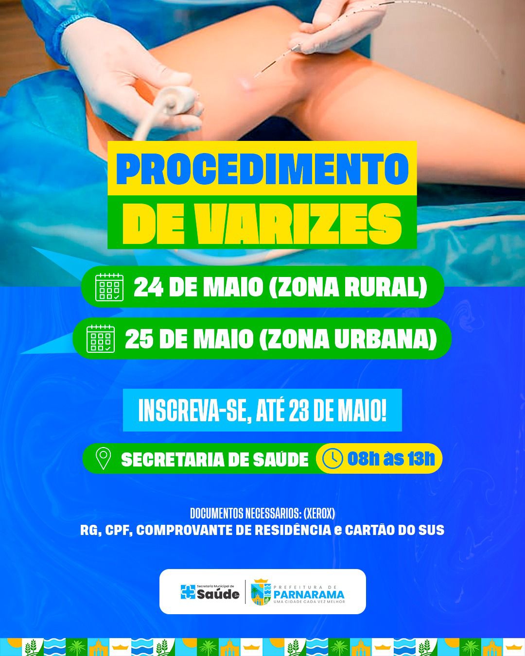 Nos dias 24 e 25 de maio, a Prefeitura de Parnarama, por meio da Secretaria Municipal de Saúde, realizará mais uma edição do Mutirão de Procedimentos para Varizes. A ação tem como foco atender, principalmente, mulheres que sofrem com problemas de circulação, oferecendo tratamentos que melhoram a saúde vascular e a autoestima.