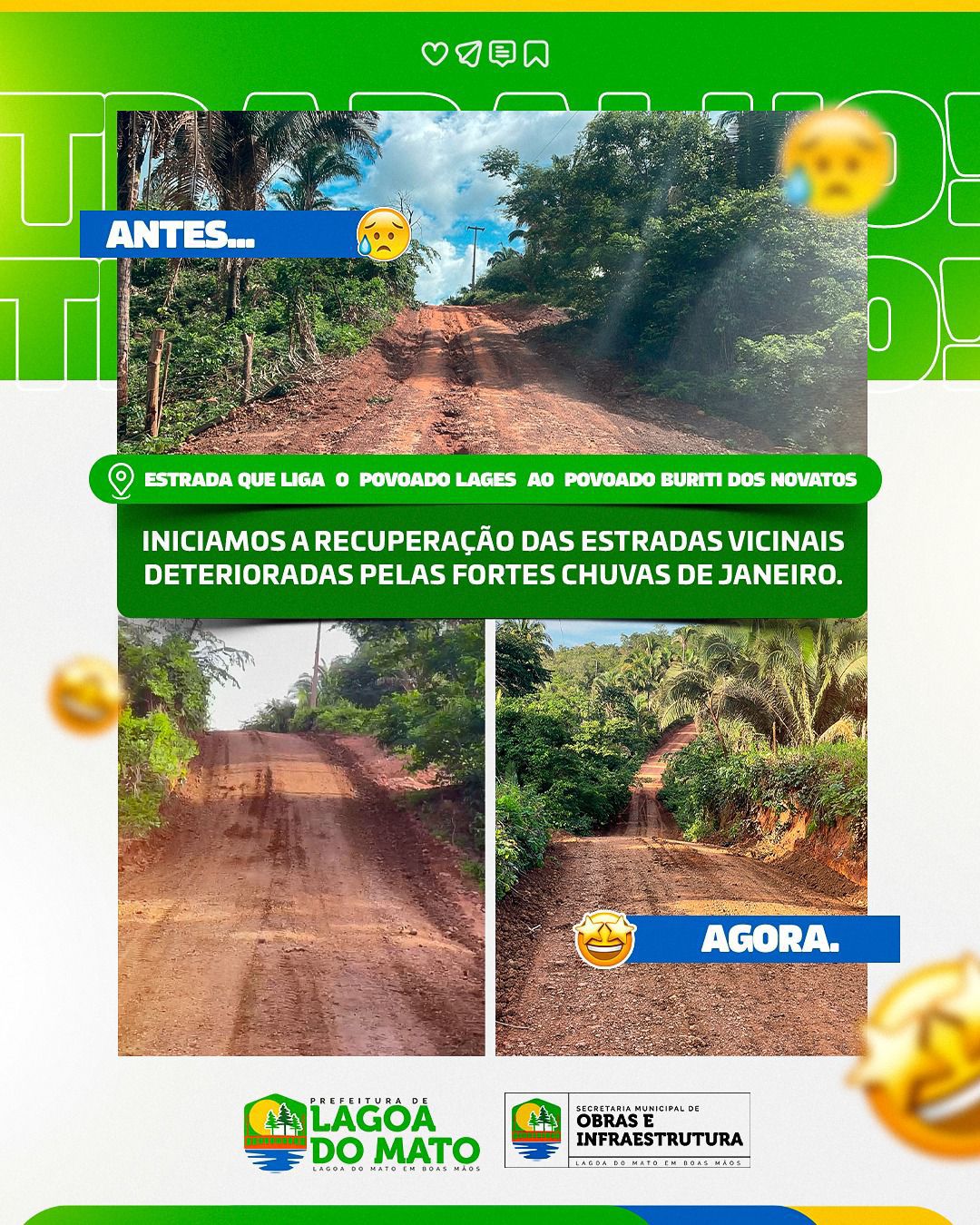A Prefeitura de Lagoa do Mato-MA deu início aos trabalhos de recuperação das estradas vicinais do município, afetadas pelas intensas chuvas que atingiram a região. Entre as vias que já começaram a receber os reparos está a estrada que conecta o Povoado Lages ao Povoado Buriti dos Novatos.